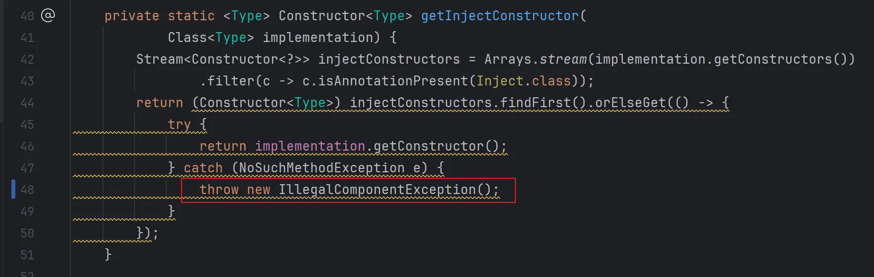 1 assertEquals(DependencyWithInjectConstructor.class, exception.getComponent());我们是将 DependencyWithInjectConstructor 绑定到 Dependency